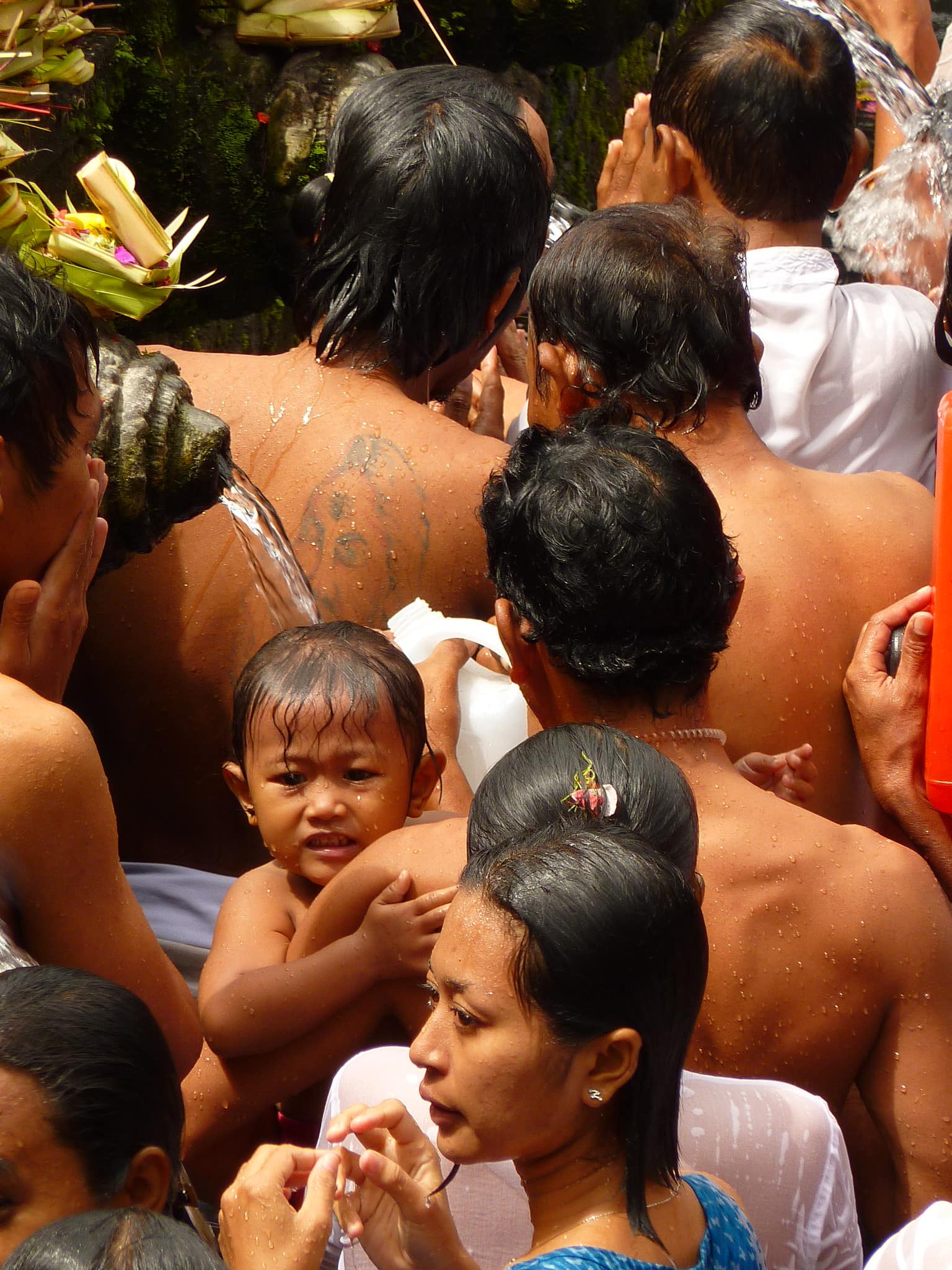 The pictures show people who stand in line to make their offerings and to start bathing at the first fountain of holy water. They then continue to the next fountain until the last one, no. 13.